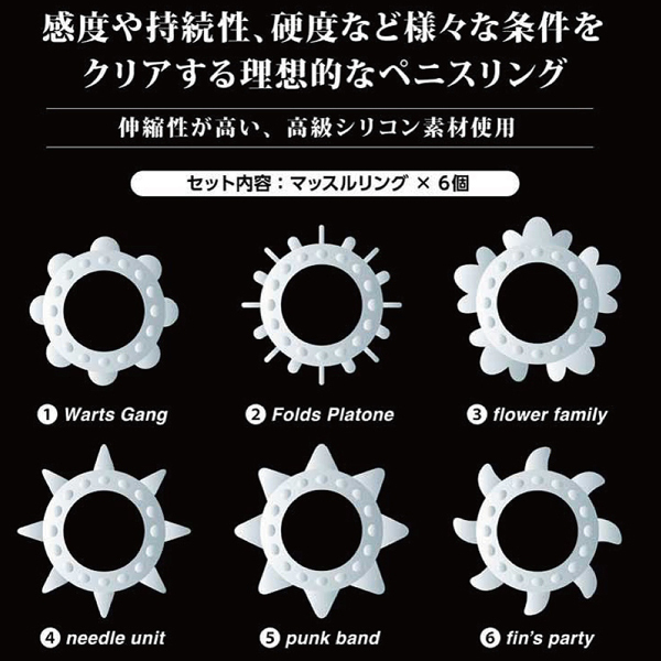 6つの個性豊かな形状が楽しめる高級シリコン素材のペニスリング。締め付けはもちろん気持ちよさや持続性、硬さなどを好みによって選べる6種類のリングが付属したお得なセットです♪