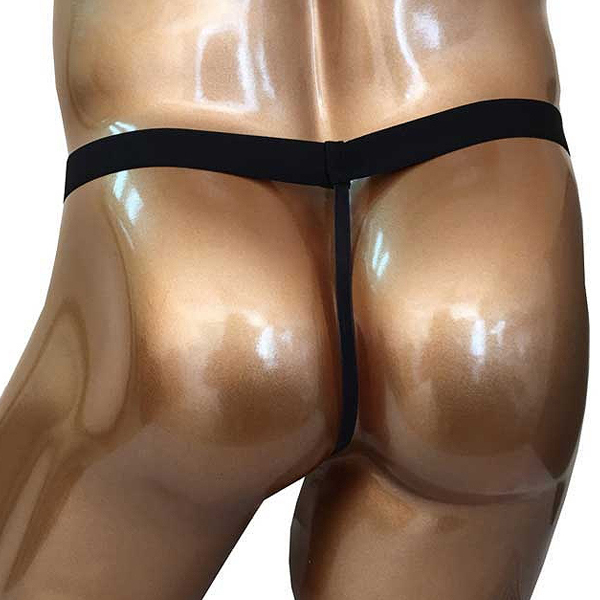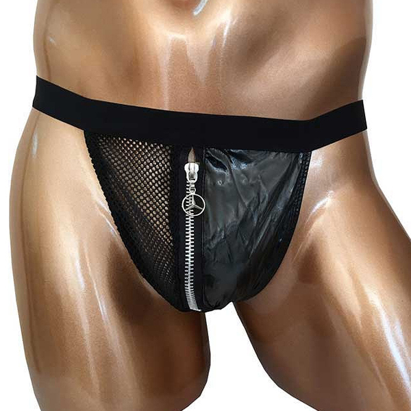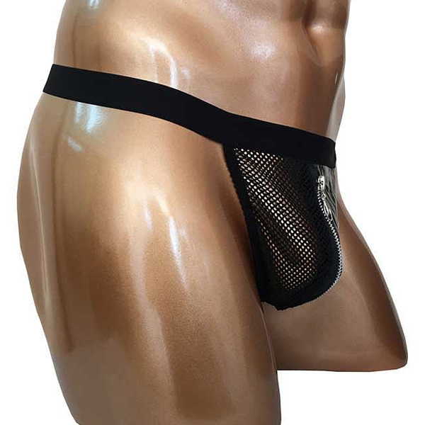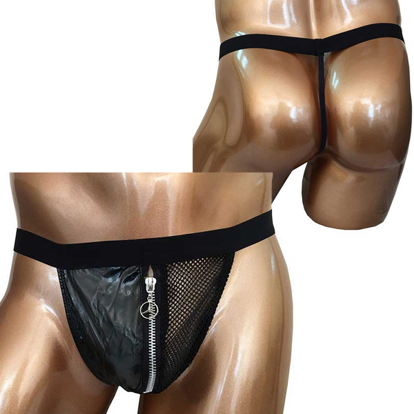 2つの異なる素材を組み合わせたスタイリッシュな男性用GストTバック。太目の黒ゴムでウエストをしっかりホールド!バックは紐状のストリング仕様で、フロントは黒地とメッシュ素材をジッパーでつなぎ合わせたお洒落なデザイン。ブラックカラー、フリーサイズ