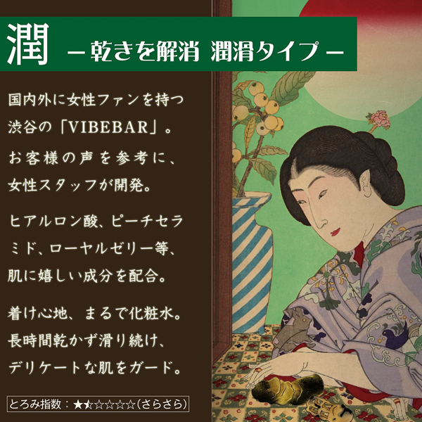 乾き、性交痛など潤い不足でお悩みの女性に♪ビタミンやヒアルロン酸、ローヤルゼリーなど、保湿成分を贅沢に配合した肌に優しい水溶性ローション。女性スタッフがユーザーの意見を参考に開発!化粧水のような優しい着け心地ながら、保湿力&持続力はかなりの実力♪また、シリコン&ポリアクリル酸Naフリーで安心度が高いのも好印象です。日本画デザインの波型ポンプボトル入り◎日本製