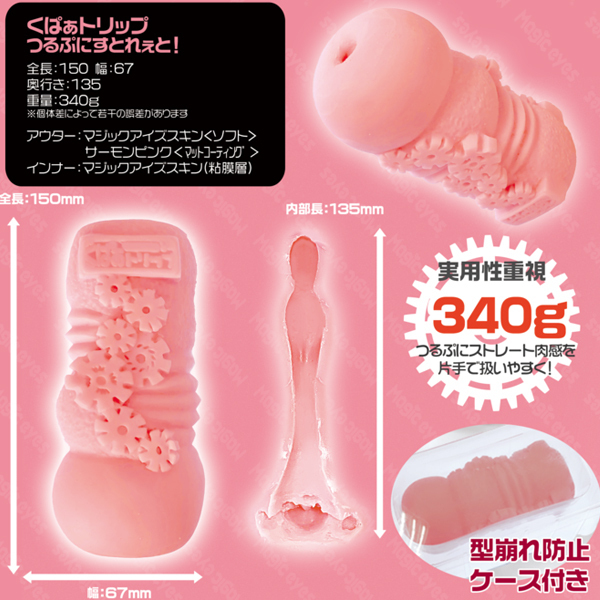 ロングプレイに最適!まったり刺激が楽しめる、つるぷにすとれーと構造の非貫通オナホ。実用性に特化した「くぱぁトリップ」シリーズに新作登場!片手で扱いやすい340g設計で、外はむっちり柔らかく、中は溝無しツルツルなストレート構造♪ねっとり柔らかな膣壁が全体を包み込み、蕩けるような快感を与えます。素材はマジックアイズスキンを使用◎ローション&ケース付
