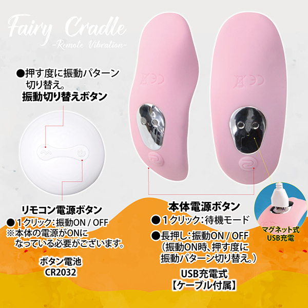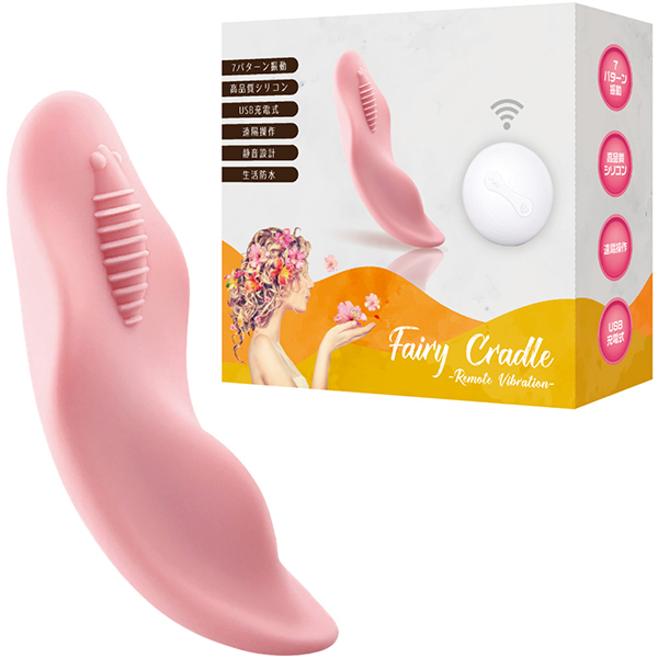 女性器の形状に的確にフィットする「フェアリークレイドル」。人間工学に基づき設計された高品質なシリコンは肌触りも良い感じ♪ハンズフリーで室内外問わずに楽しめて、なめらか形状・質感のボディが気持ちいいところにジャストフィットします。本体はマグネット式USB充電でリモコンも付属!ショーツの内側に装着して遠隔操作で多彩な快感振動が楽しめる非挿入型のリモコンローターとなっています♪7パターンの振動にUSB充電式!高品質シリコンだから使い心地もよく、遠隔操作で静音設計となっています。生活防水仕様だからユーティリティ面もバッチリ!手持ちしてのローターとしてもお楽しみいただけます。
