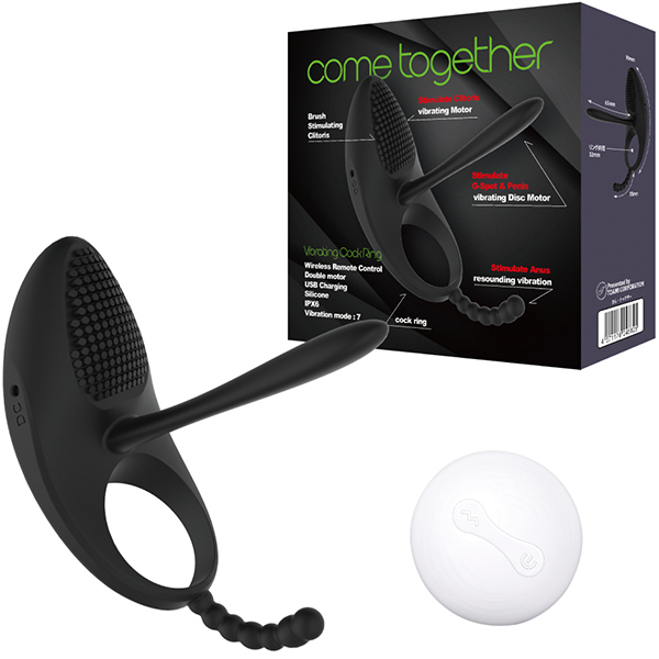 女性を喜ばせるコックリングが超絶進化した!クリへの振動も楽しめる電動コックリング「カム・トゥゲザー」。電源はUSB充電式でリモコン操作が可能♪簡単に装着できてクリへの振動はもちろん、ペニスと共に挿入するサブシャフトも振動するのでアナルへもアプローチできるというトリプルギミックを搭載!中も外も男性自身も振動を味わいながらプレーが楽しめて、男性自身を締め付けながら増強を促す効果も♪各種バイブレーションがリモコン操作できるので振動変化もお楽しみいただけます!7パターンの振動機能にUSB充電式でケーブル付属。シリコン素材でIPX6防水仕様と心強いスペックとなっております♪底部のフックしたアナルビーズのような短いシャフトはアナルに挿入することも可能です。
