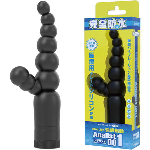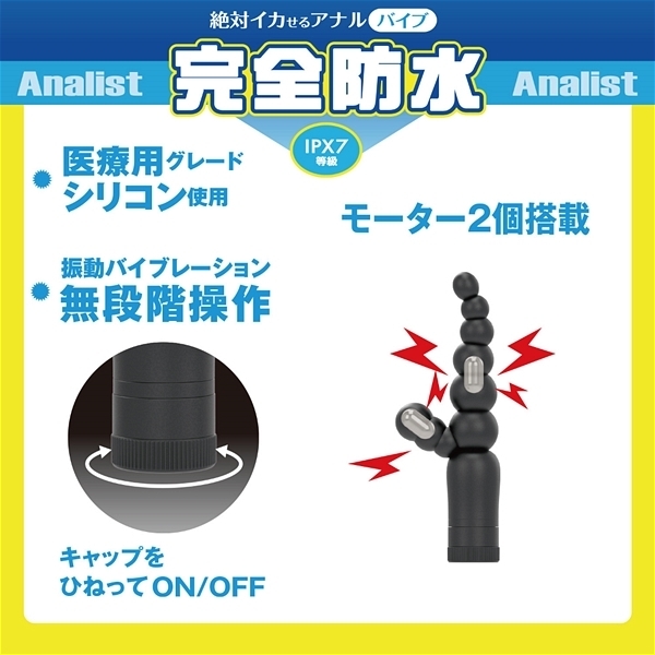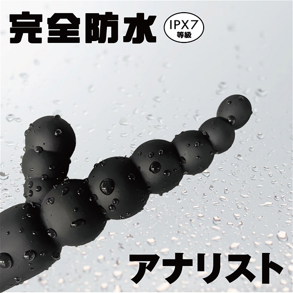 ソフトに曲がる6連ボールが会陰部を的確に刺激!初心者からアナル上級者まで愛用する人気のアナルバイブが待望の完全防水化(IPX7)。アナリスト001はソフトに曲がる6連ボールと会陰部への刺激を行うタイプ!先端部分に近づけば近づくほど細くなっていく構造で、これならアナル初心者でもしっかりと楽しめますね♪じわじわとアナルを突き進む快感と充足感をたっぷりと味わってください!