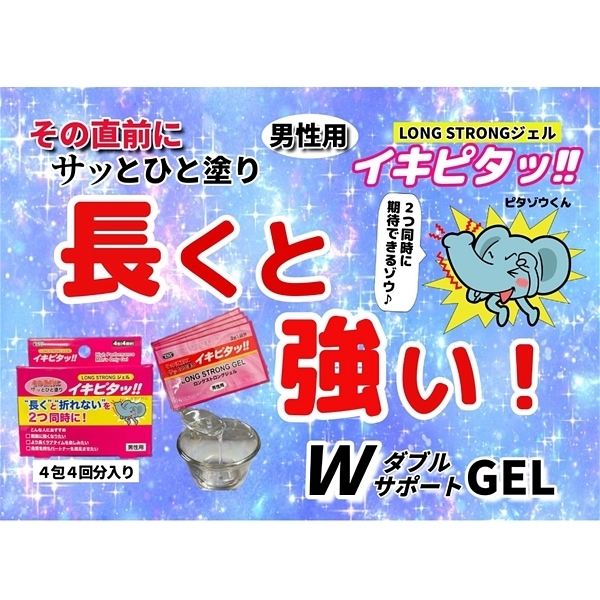 男の武器!”長く”と”折れない”を2つ同時に!ナイトライフをWでサポートしてくれる男性用ジェル「イキピタッ?」が新登場。イザという時の直前にサッとひと塗りすれば普段よりも楽しめるロングプレイとパートナーを満足させる男性力もWをサポート。1回分の使い切りタイプだから持ち運びにも便利!ジェルは無色透明で伸びが良いなめらかな使い心地になっておりほぼ無臭です。完全国内生産だから安心してお使い頂けます。2g×4回分