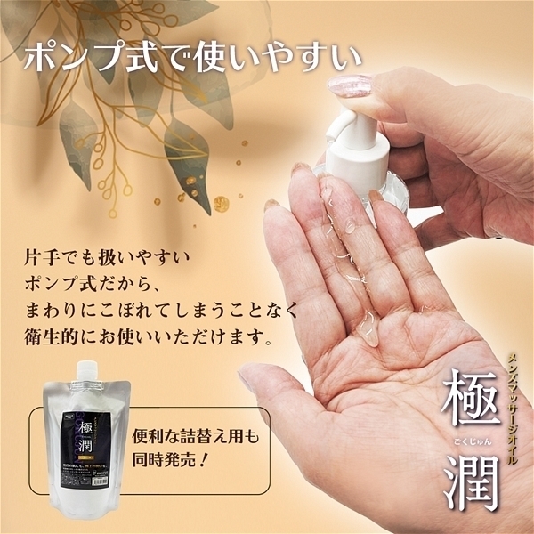「最上級の潤い」、「最上級の滑らかさ」、さらに「最上級の使いやすさ」を追い求めて完成したマッサーオイル「極潤」。保湿に優れたグリセリンに加えヒアルロン酸Naを贅沢に配合することで使用後はもっちりぷにぷにしたお肌に仕上がります。熱伝導に優れた温感タイプなので塗った瞬間からじんわり温かく感じます。※成分上、舐めると甘く感じますが飲み物ではございません、飲み込まないようにご注意ください。大変滑りやすいので足元にこぼさぬようご注意ください。ボトルタイプ