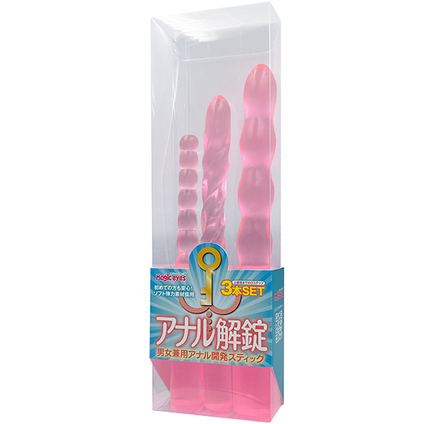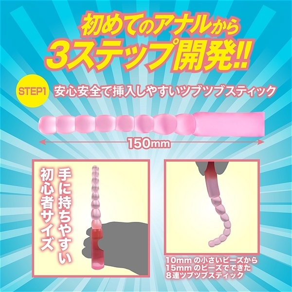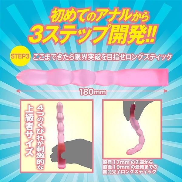 初めてのアナルから3ステップ開発用3本セット!!男女兼用ソフトな弾力素材を採用した日本製。STEP1全長150mm先端部の径10mmのつぶつぶスティック。STEP2全長170mm先端部の径13mmの拡張しつつ刺激も楽しめるらせん状スティック。STEP3全長180mm先端部の径16mmのパール風ロングスティック。●カラー:ピンク