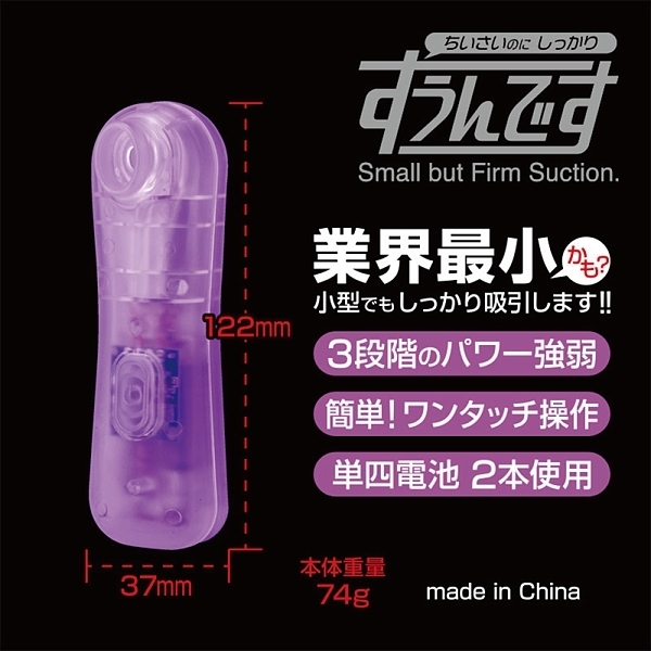 現在、流行中の吸引系ローター。その中でも最小・最軽量・最安を目指して作られたのが、この「すうんです」です。単四電池2本を入れ、電源スイッチ長押しでスタート。あとは電源スイッチを短押しすることで、3段階のパワー強弱をお楽しみいただけます。本製品は小型で簡易的なモデルですが、十分な吸引力を発揮。手軽に、コンパクトに、吸引ロータを楽しむことが可能です。最小・最軽量・最安にこだわった吸引ローター「すうんです」。小型だからと侮らずに、お試しください。●カラー:スケルトンパープル