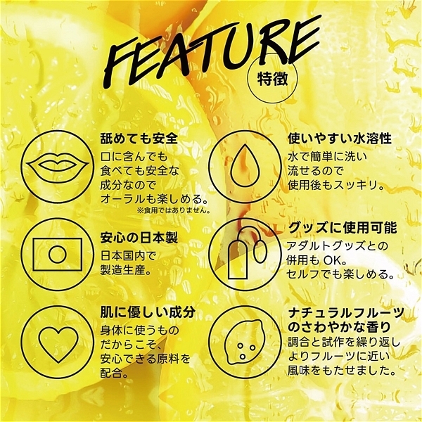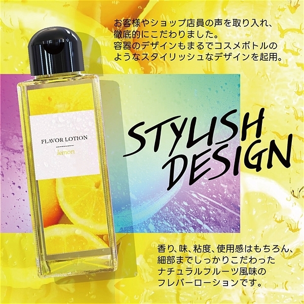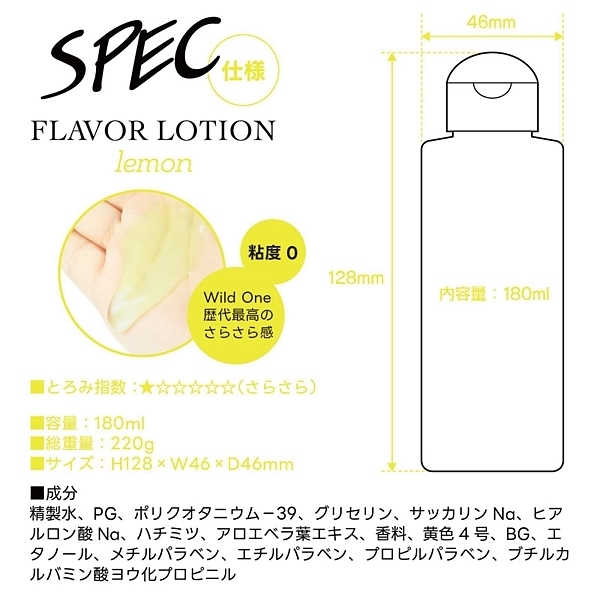 レモン。フルーティーな味と香りで新感覚プレイ!ワイルドワン女子が企画・開発した女性のためのフレバーローション!安心安全の国内素材で水のように「超さらさら」、フルーツみたいに美味しい水溶性ローションです!<成分>精製水、PG、ポリクオタニウム-39、グリセリン、サッカリンNa、ヒアルロン酸Na、ハチミツ、アロエベラ葉エキス、香料、黄色4号、BG、エタノール、メチルパラベン、エチルパラベン、プロピルパラベン、ブチルカルバミン酸ヨウ化プロビニル。※「本製品はバイブバー公式認定ローション 味・香り付き」の後継として開発されましたが味と香り付きという点以外は、成分もテクスチャもまったく異なる新製品です。