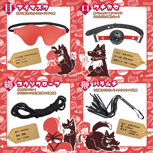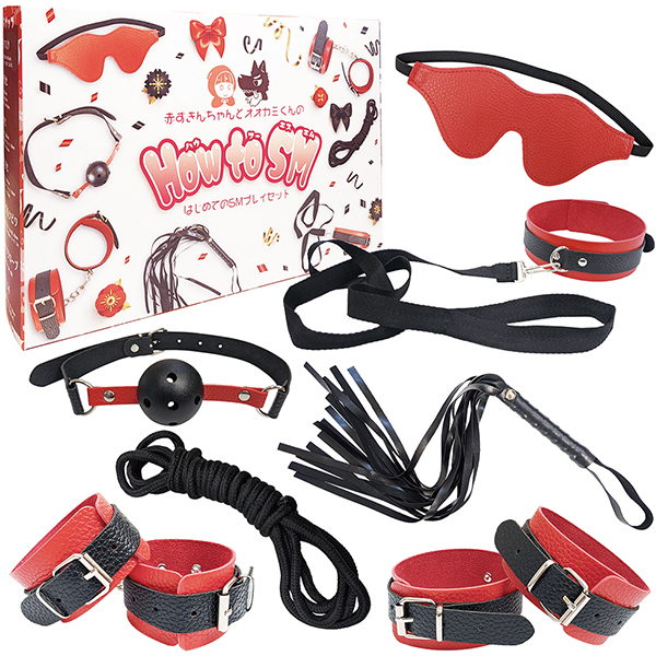 ◆アイマスク:視界が塞がれることで、相手の動きがわからないドキドキ感がSMごっこはじめの一歩。肌に当たる面は、柔らかなベロア風。ゴムひもで使いやすい仕様です。◆クチカセ:ガマンすればするほど、いやらしくよだれが垂れちゃう!ベルト式で、サイズは7段階に調節可能。◆テカセ&アシカセ:動けないスリルとワクワク感がせめぎ合う!チェーンは取り外し式。ベッドの柱に通すときも簡単です。手と足で拘束することもできます。肌に当たる面は、柔らかなベロア風だから痕も残りにくく安心。◆リード&クビワ:よしよし楽しいお散歩プレイ。ペットのように相手を可愛がってみよう。上手にできたらとっておきのご褒美を…。首のベルトは6段階に調節可能。リードは首輪本体から取り外しできます。肌に当たる面は、柔らかなベロア風だから痕も残りにくく安心。◆コウソクロープ:自由がきかない!ロープ間から垣間見えるからだのエロさをじっくり観賞。上手に縄を締められたときの達成感も醍醐味。◆バラムチ:ガマンできない悪い子にはお仕置き!初心者にも扱いやすい短めのバラ鞭です。持ち手は手首通しが付いてるから、プレイ中もすり抜ける心配もなし。