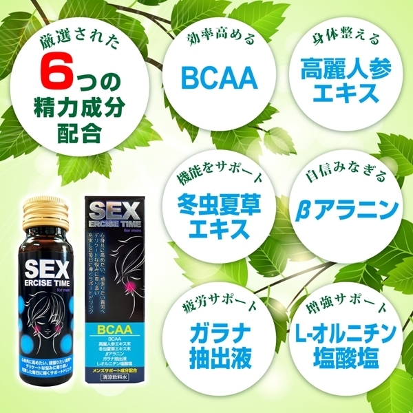 心身ともに自分を高めたい貴男のためのサポートドリンクです♪業界初のコンセプトである「セクササイズ」を実現しました! BCAA、高麗人参エキス、冬虫夏草、βアラニン、ガラナ抽出液、L−オルニチン塩酸塩の6つの厳選成分を配合しています♪理想の自分になりたい方にぴったりのドリンクです!悩みと真剣に向き合いたい方、今の自分に負けたくない方にもおすすめです。【お召上がり方】1日1本を目安に、よく振ってお召し上がりください。【ご注意】原材料が沈殿を生じたり、時間の経過によって液色が変化する場合がありますが、品質には問題ありません♪