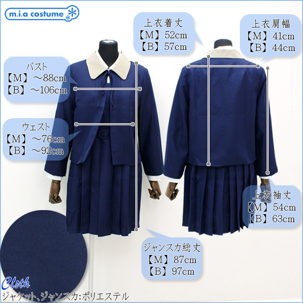 セット内容:ジャケット(襟取り外し可・肩パッド入り)、丸襟ブラウス(前開き・ボタン留め)、ジャンパースカート(バストからウエスト部分に肩ボタンとサイドボタンで着脱可・ベルト取り外し可)、ベルト※レトロな雰囲気漂うボレロが可愛らしい制服コスプレ(BIG)。中に着たジャンパースカートは、ハイウエストのノースリーブ仕様!お洒落のボレロの襟とリボンがポイントに!リブハイソックスや黒タイツと合わせて着こなしたい、お嬢様学校風の制服コスチュームです。※水洗い不可、塩素系漂白剤による漂白不可、アイロンは中温で当て布使用、ドライクリーニング可、色落ちの可能性があります。※こちらの商品は在庫の状況によりお届けまでに4日〜7日程度かかる場合がございます。