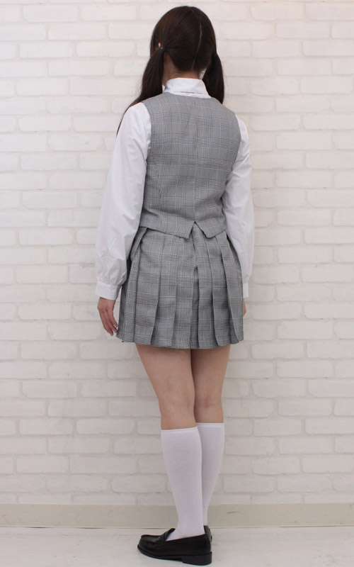 金ボタン付きのベストがポイントになった中間服タイプ!グレーチェックで清楚なお嬢様風に仕上げた制服コスプレ(BIG)。シャツ、スカート、リボンにベストの豪華4点セット!優等生気分が味わえる、お洒落な制服コスチュームです。※水洗い不可、塩素系漂白剤による漂白不可、アイロンは中温で当て布使用、ドライクリーニング可、*色落ちの可能性があります。