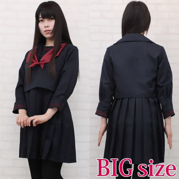 赤の3本ラインがキュート!珍しいジャンパースカートタイプのセーラー服(BIG)。ノースリーブのジャンパースカート、セーラーブラウス風のジャケットと赤スカーフのセット!清楚な冬服の制服コスプレで、お嬢様気分を味わおう!※水洗い不可、塩素系漂白剤による漂白不可、アイロンは中温で当て布使用、ドライクリーニング可、色落ちの可能性があります。※こちらの商品は在庫の状況によりお届けまでに4日〜7日程度かかる場合がございます。