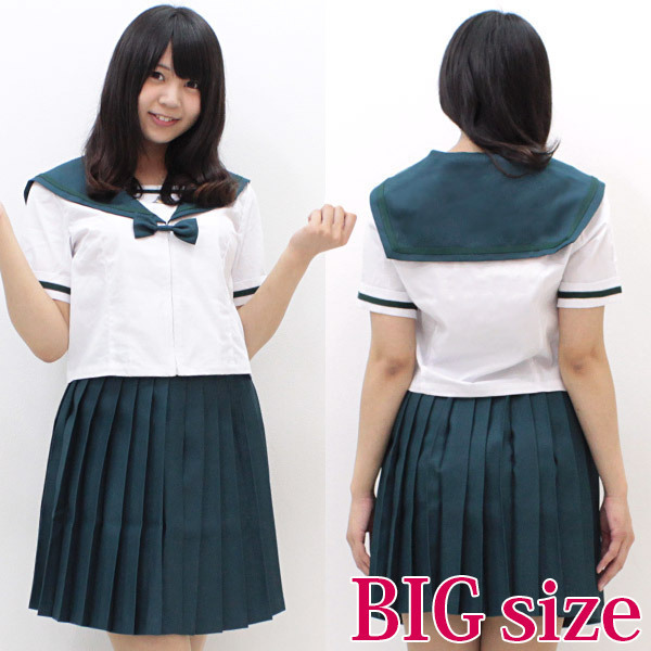 清楚系の雰囲気満点!落ち着いたお嬢様カラーが可愛い夏服仕様のセーラー服(BIG)。ちょっぴり珍しい深緑色と、ちょこんとついたリボンがキュート!クオリティの高い制服コスプレでお嬢様になりきっちゃいましょう。※水洗い不可、塩素系漂白剤による漂白不可、アイロンは中温で当て布使用、ドライクリーニング可、色落ちの可能性があります、ご注意ください。※こちらの商品は在庫の状況によりお届けまでに4日〜7日程度かかる場合がございます。