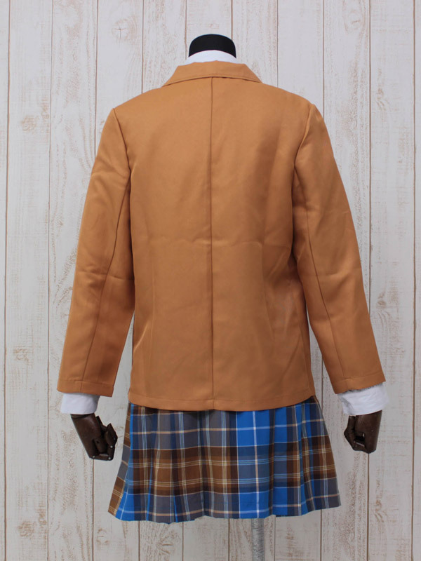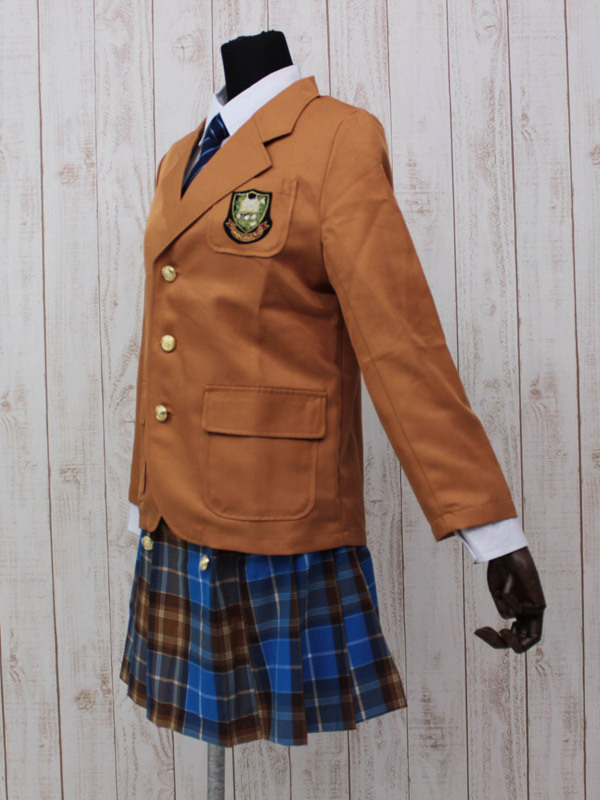 中高一貫のお嬢様気分を味わえそう♪キャメル色のブレザーがオシャレな冬用スクール制服。●フロントを金ボタンで留めるキャメルブレザー●胸ポケットに紋章風の刺繍ワッペン付き●6つの金ボタンがあしらわれた青×キャメルのチェックスカート●斜めストライプ柄ネクタイも付いた4点セット。他の制服とは異なる個性的カラーがバツグンに可愛い!周りに差をつけたい方にオススメな長袖制服コスチュームです。※水洗い不可、塩素系漂白剤による漂白不可、アイロンは中温で当て布使用、ドライクリーニング可、色落ちの可能性がありますのでご注意ください。※こちらの商品は在庫の状況によりお届けまでに4日〜7日程度かかる場合がございます。