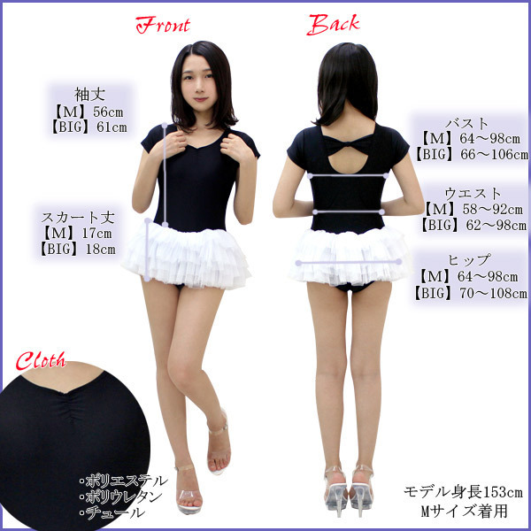BIGサイズ:B66〜106cm・W62〜98cm・H70〜108cm・着丈57cm・袖丈11.5cm・スカート丈18cm セット内容:レオタード単品(一部当て布付き) 素材:ポリエステル、ポリウレタン、チュール