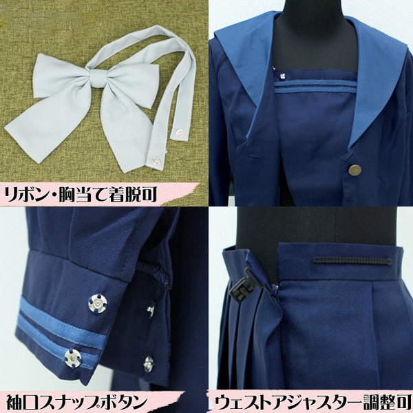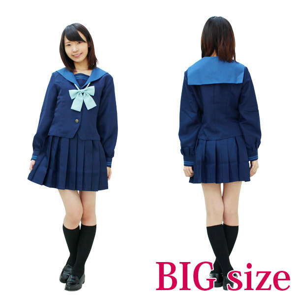 学生らしいさわやかブルー系♪襟の色が特徴的な人気の旧冬服セーラー服(BIGサイズ)。紺無地のセーラーブラウスとプリーツスカートに、ブルーグリーンのリボンがポイントの制服コスプレ。胸当てとリボンはスナップボタンで着脱可能です。※水洗い不可、塩素系漂白剤による漂白不可、アイロンは中温で当て布使用、ドライクリーニング可、色落ちの可能性があります。