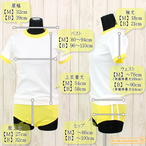 BIGサイズ B96〜110cm・W〜90cm(伸縮時最大114cm)・H〜100cm 上衣:着丈58cm・肩幅39cm・袖丈21cm ブルマ:股上丈32cm セット内容:上衣、ブルマ 素材:ポリエステル65%、コットン35%
