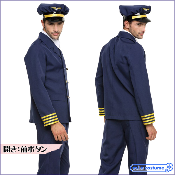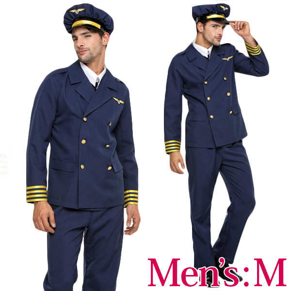ハロウィンの夜はお洒落に決める♪憧れのパイロットになりきれる格好いい機長コスプレ。落ち着きのある紺の制服にゴールドカラーがアクセント!最高にCOOLな男を演出してくれるメンズ用のパイロット風ハロウィンコスプレ♪ジャケットは着脱しやすい前ボタン仕様、付襟やネクタイなど小物付き。※洗濯不可、塩素系漂白剤による漂白不可、アイロンは中温で当て布使用、ドライクリーニング可※こちらの商品は在庫の状況によりお届けまでに4日〜7日程度かかる場合がございます。