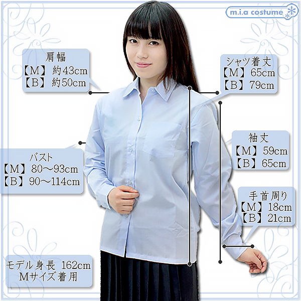 Mサイズ:着丈65cm・袖丈59cm・肩幅43cm・手首周り18cm セット内容:シャツ単品 素材:ポリエステル65%、綿35% モデル身長162cm(Mサイズ着用)