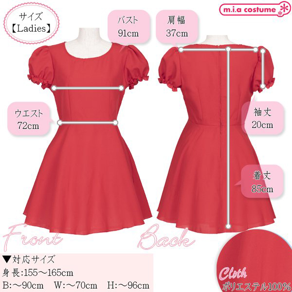 対応サイズ:身長155〜165cm・B〜90cm・W〜70cm・H〜96cm 実寸:B91cm・W72cm・肩幅37cm・袖丈20cm・着丈85cm セット内容:ワンピース単品(背中心ファスナー) 素材:ポリエステル100% モデル身長155cm