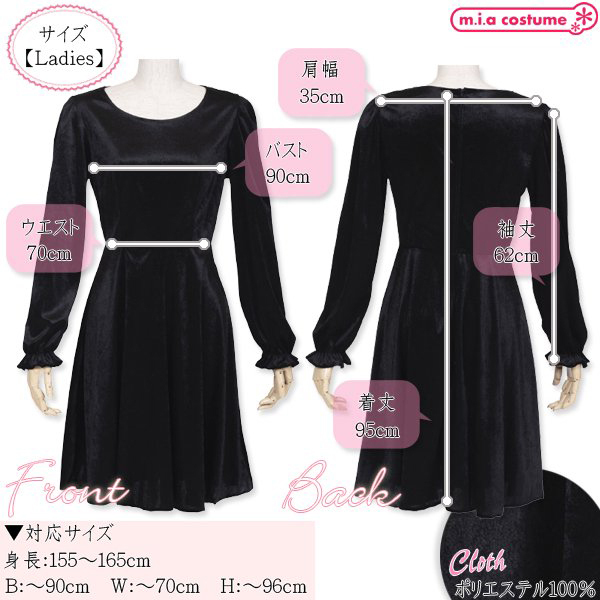 対応サイズ:身長155〜165cm・B〜90cm・W〜70cm・H〜96cm 実寸:B90cm・W70cm・肩幅35cm・袖丈62cm・着丈95cm セット内容:ワンピース単品(背中心ファスナー) 素材:ポリエステル100% モデル身長155cm