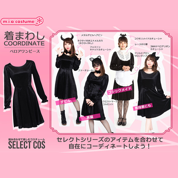 着回し力がすごい!セレクトしてオリジナルのコーディネートが楽しめちゃうコスプレシリーズ!ベロアワンピースはクラシカルなテイストにぴったり。フリルカチューシャ、付け襟、エプロンを合わせれば、洋館のメイドさんに変身♪他にもセレクトシリーズの小物を合わせて色々なコスプレを楽しんでね。※洗濯機不可、弱い手洗い可、塩素系漂白剤による漂白不可、アイロンは中温で当て布使用、ドライクリーニング不可