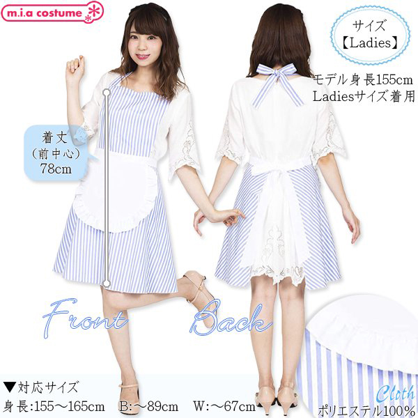 対応サイズ:身長155〜165cm・B〜89cm・W〜67cm 実寸:着丈78cm(前中心) セット内容:エプロン単品(首リボン、腰リボン) 素材:ポリエステル100%