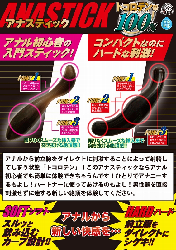 超話題!前立腺刺激で射精する「トコロテン」が楽しめるアナルスティック。太さの異なる両端から真ん中に向かって徐々に太くなった丸みのある形状で、スルッと挿入できちゃうから初心者にもオススメ。コンパクトなスティック型ボディで前立腺をダイレクトに刺激します。「トコロテン率100%」を誇る、前立腺マニアも納得のハードなアナルスティックです。