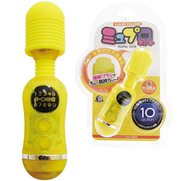 ノーマル&ブラシの2WAYヘッド仕様!小さいながらも多機能なミニ電マ(クリアイエロー)。汚れにくいマットコーティングのシリコンヘッドは、女性に優しい柔らかなタッチを実現!そのキュートなボディとは裏腹に、10パターンの強力バイブレーションを搭載!ノーマルで押し当てたり、ヘッドを外してブラシでのピンポイント刺激も可能!さらに、表示部にはLEDバックライトも搭載しています。お手入れの簡単な生活防水仕様の電マ型ローターです。ボタン電池(LR44)×6個使用。