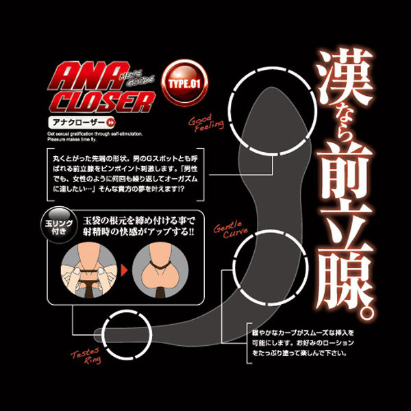 男のGスポットを直撃!ソフト素材の前立腺グッズ「アナクローザー TYPE.01」。挿入をサポートする、緩やかなカーブボディの少し尖った亀頭型先端が、男のGスポットである前立腺をピンポイントで刺激します!また、リングの持ち手部分を玉袋の根元に掛ければ、締め付け効果により射精時の快感も上昇!女性のように何回もオーガズムに達したい!という方にお勧めの男性用アナルグッズです。