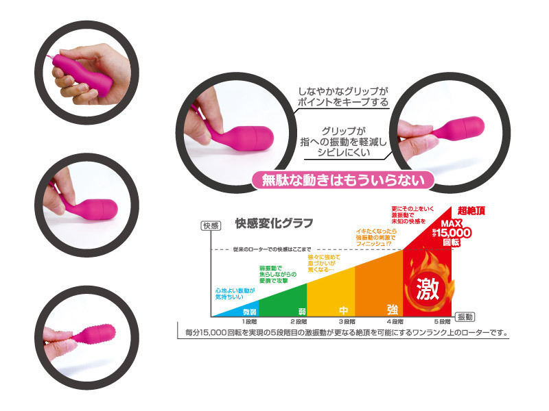 定番のシングルローターに使いやすさをプラス!持ち手部分がついてグッと遊びやすくなったコンパクトローター。尻尾のようなつまみ部分を持って使用することで、振動による手の痺れがなくなって快適!より長く責めることができるようになり、ラブタイムにもいっそう熱が入るかも。微弱〜激までの5段階調節で、未知の快感を得られるシングルローターです。単四電池×2本使用。