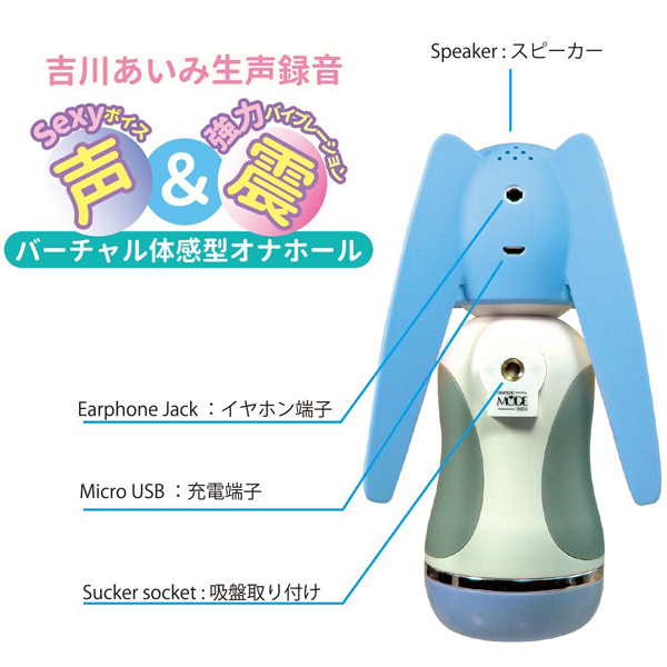 人気AV女優「吉川あいみ」の生音声を聴きながら極上のオナニーを楽しめる体感型オナホール。●クリクリお目目が可愛いi:MEのスカイver●前髪部分に3つのボタンスイッチ●真ん中ボタン…電源ON/OFF●右(♪)…音声ボタン●左…振動ボタン●本体底部ホールキャップ●USB充電式●背面…イヤホン端子・充電端子・吸盤取り付け口あり●充電&電源ONの際は赤色のLEDランプ点灯●内部構造が異なるオナホ2点付き●青…ミミズヒダ&密着ツブ構造●白…ミミズヒダ&イボ突起構造●強力吸盤付きなのでお好きな場所に固定可●ホール底部にローターを差し込んでから使用してください。あいみちゃんのSexyボイスを聴きながらのオナニーはまるで本当にSEXしているかのよう…!腰振りオナニーがハンズフリーでもお楽しみいただける男性用アダルトグッズです。※無理にホールを引っ張るとローターが断線する恐れがありますのでご注意ください※音量調節不可(ヘッドホン、イヤホン使用可能)