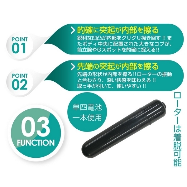 挿入しやすいスリムヘッドで前立腺&Gスポをキャッチ!プラグ風のスティック型アナルバイブ「プロクトスティック ジョイ」。●メリハリのある高弾力なボディ●扱いやすいグリップリング付き●先端が前立腺をダイレクト刺激●内部をグリグリ圧迫する大コブ●腸全体に響き渡るローター振動●三段階の振動強弱切り替え搭載●内蔵ローターは取り外し可能。細身の先端でスムーズ挿入&ピンポイント刺激!グリグリ掻き回して下半身を震撼させる電動アナルグッズ。スリムな先端のスティックタイプながら、プラグのように膨らんだボディ中央のコブでしっかりとした挿入感に!さらに、ローター振動との相乗効果でより深い快感を味わえる次世代型のスティックバイブです。※電池周囲の保護用シートは外さないでください。