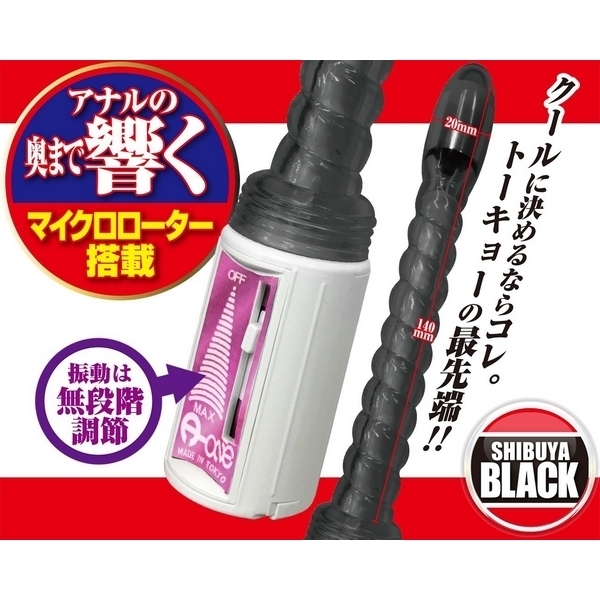 アナルトーキョーからシリアナ快感を世界へ!奥まで響くマイクロローターを搭載したスティック型アナルバイブ。●渋谷ブラックカラータイプ●フレキシブルな柔軟ボディ●ポコポコ刺激のスクリュー型●挿入部約14cm、最大径約2cm●先端にマイクロローター搭載●奥まで届くパワフルな振動●振動調整は無段階スライド式●安心安全な日本製グッズ。ぷっくりヘッドにパワフルモーターを搭載した、スリムなスティックフォルムの電動アナルグッズです。