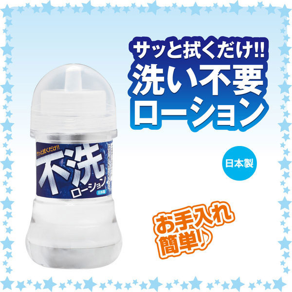 オナホオナニーのお供に♪サッと拭くだけの洗い不要ローション「不洗ローション 150ml」。●無色透明のクリアローション●ベタつきが残らない洗い不要●拭き取るだけの簡単お手入れ●高品質で安心安全な日本製●携帯にも便利な内容量150ml。使用後はティッシュ等で拭き取るだけ!面倒な後処理の要らない洗い不要タイプのローションです。