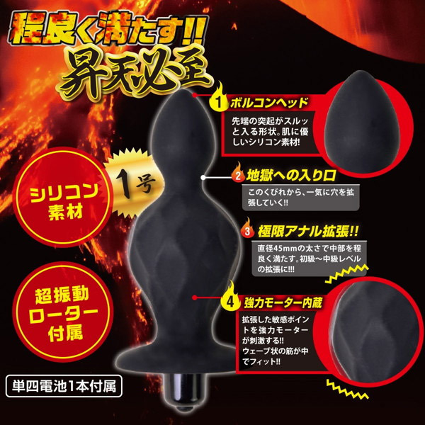 昇天必至の超強力ローター搭載!強烈な刺激が癖になる電動アナルプラグ「ボルコン1号」。二段の膨らみを持つくびれボディはシリコン素材で滑らかな肌触り!表面にはウェーブ筋を入れて刺激をプラス。スルッと入る先端ボルコンヘッドの先にあるくびれを超えると、二つ目の大きな膨らみが腸内を程よく満たします。さらに、拡張した敏感ポイントに強力振動ローターが刺激を与える悶絶必至のアナル拡張グッズ。初級〜中級者向けサイズの1号は全長11cm、最大径はシリーズ最小でも4.5cmとやや大きめです。単四電池×1本付属。