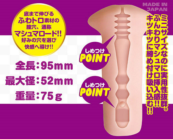 刺激系・緩穴系・狭穴系、3つの異なる内部形状を、ふわトロ素材で手軽に楽しめるミニオナホの決定版!底まで伸びるふわトロ素材の膣穴、通称『マシュマロード』射精感抜群な好みの穴を選び快感へ導け!最も狭穴のアユミはキュっと締まった膣道で竿全体を絞り上げて奥まで吸い込み射精を促す!●高品質な純国産●非貫通タイプ●専用ローション付き