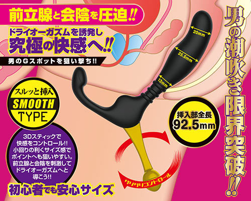 前立腺や会陰刺激でドライを誘発!初心者さんでも手軽に使えるアナル用グッズ。コンパクトで小回りが利きやすくピンポイントに狙いやすい♪3Dスティックで欲しい箇所をグリグリと圧迫刺激すれば、快感が高まり男の潮吹きまで一直線!滑らかな挿れ心地のシリコン製でツルっと挿入できるSMOOTHタイプ。