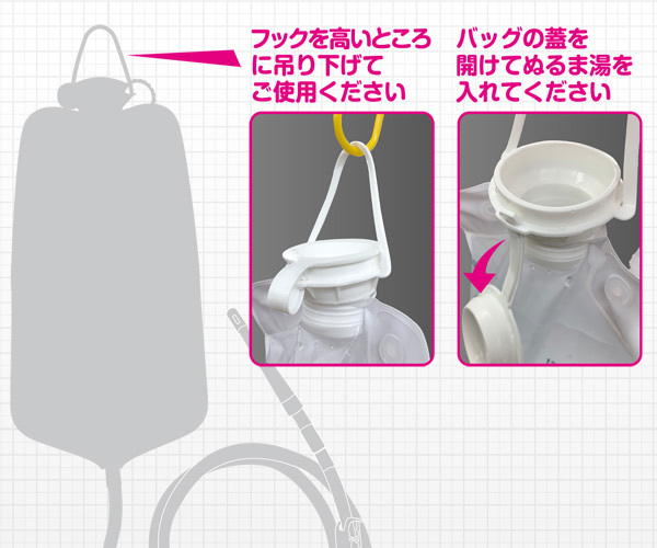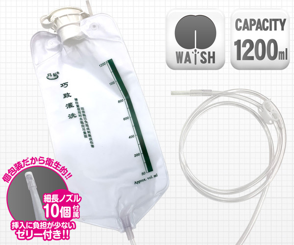 人気医療系グッズの「メディシリーズ」から、家でも外でも手軽にお尻を洗浄できる大容量1200mlサイズのエネマバッグ。高さ31cm、幅15cm、使用後は丸めて運べるコンパクト設計!個包装のゼリー付き細長ノズル10個が付いていて衛生的、さらに155cmのロングチューブまでセットとなっています。蓋を開けてぬるま湯を入れ、フックを高い所で吊り下げお使いください