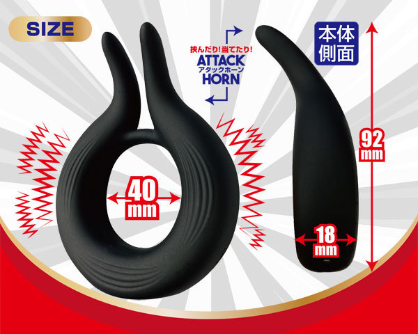 一般的なローター付きコックリングとは比較にならない本格派!極太で肉厚のリング(リングの厚みは1.8cm)を採用した泣く子も黙る「ギガントロングリング」。電動タイプのペニスリングや電動サックを探していた方も、これさえあれば勃起力と持続力が大幅にアップ!先端部分の2つのツノがクリを挟み込み、密着時にはお互いが刺激を得られます♪本体はシリコン製で内径は約4cm。10段階の振動が根本から震わせ持続力と勃起力をしっかりサポート!電源はマグネット接続のUSB充電式でIPX7相当の高い防水性が自慢。付け心地抜群で触り心地もなめらか!約90分の充電で連続1時間の使用が可能です。