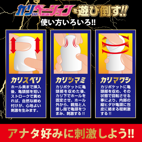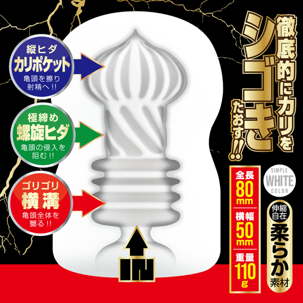 普通のオナニーに飽きてしまったあなたに贈る、亀頭専用次世代オナホ。亀頭への刺激を重点的に考え開発されたカリベーション!オナニーに集中がしやすいホワイトカラーのボディと、一切の無駄を省いたシンプルな造形が特徴。挿入し、擦ったり引っ張ったり摘まんだり、あなた好みに刺激すればカリコキ爆快感が得られます!挿入口はスリ鉢状になっているので、全体にローションを塗り広げられるからとっても便利。本体はソフト素材なので伸縮自在。亀頭を集中的に刺激し、感じた事のない快感をつかめ!