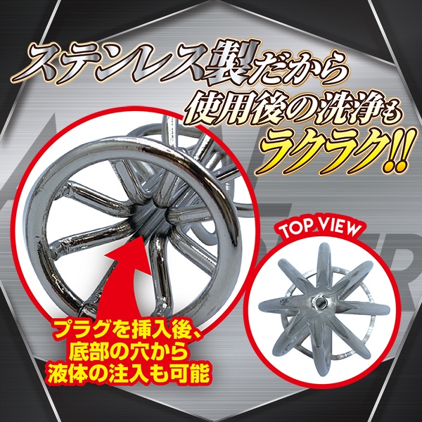 エグる!メリ込む!内部を掻きまわし、腸圧迫!メッシュ状のメタルボディがメリ込みながら内部を圧迫。ハードな刺激が次第に快感へ変わり痛気持ち良さの深みにハマる!プラグを挿入後、底部の穴から液体の注入も可能!ステンレス製なので温熱・冷却しての使用、煮沸消毒もOK♪使用後の洗浄もラクチン。磨き上げられたメタルボディでハードにエグれ!!!Lサイズは上級者も大満足!