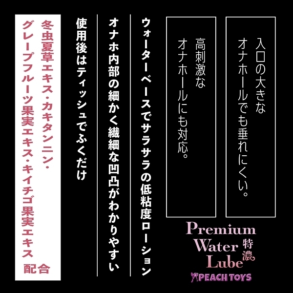 『水のように滑らか、でもヌルヌル感持続!ふき取るだけでOK!』「ふくだけローションPremium Water Lube (180ml)」が、ラベルデザインと容量・成分をリニューアルして再登場です!白いポンプの「ふくだけPWL 特濃」は、【低粘度+濃厚な液体】入口の大きなオナホールでも垂れにくい。高刺激なオナホールにも対応。冬虫夏草エキス・カキタンニン・グレープフルーツ果実エキス・キイチゴ果実エキス配合●ウォーターベースでサラサラの超低粘度ローション●オナホ内部の細かく繊細な凹凸がわかりやすい●使用後はティッシュでふくだけ簡単●無香料●安心の日本製●500ml 特濃 <成分>水、プロパンジオール、ヒドロキシエチルセルロース、乳酸、キサンタンガム、ローヤルゼリーエキス、アルギニン、マカエキス、水溶性コラーゲン、グリチルリチン酸2K、ローズマリーエキス、モモ葉エキス、カキタンニン、銀、フユムシナツクサタケエキス、クエン酸、クエン酸Na、BG、エタノール、セルロースガム、炭酸水素Na、フェノキシエタノール、EDTA-2Na、ブチルカルバミン酸ヨウ化プロピニル