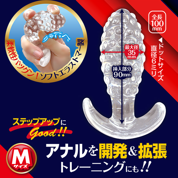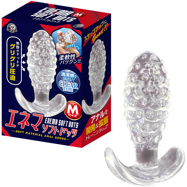 表面に無数のドットイボが配された圧迫感の効いたアナルプラグ「エネマソフトドッツM」です♪アナルも悦ぶ無数のドット刺激が真新しい!挿入部分の無数のドットがアナルにフィットしアナル開発や拡張を徹底サポート♪挿れやすくて抜けにくい設計だからアナルプレイが存分に楽しめる!ソフトエラストマー製だから柔軟性もバツグンで丸洗いもできて何度も使用OK♪使いやすいストッパー付きで安心してお使いいただけます!見た目も美しいクリアタイプのアナルプラグでステップアップにちょうどいいMサイズ♪Sサイズに慣れてきたらちょっとずつ拡張していこう!