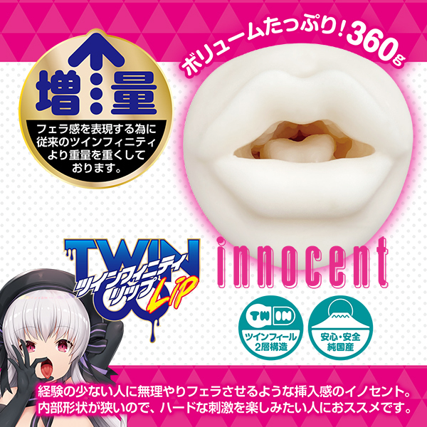 人気のツインフィニティシリーズに、ボリュームたっぷり!肉厚フェラタイプ登場!シリーズの特徴である、本体の前半と後半で硬度が異なる構造はそのままに、本作はフェラ特有の「包み込むような心地良さ」「征服感」などを追求。フェラとは何かを真正面から向き合い開発されたフェラホールとなっています。今までとはまたひと味違ったツインフィニティを、ぜひ味わってみて下さい。<イノセント特徴>経験の少ない人に無理やりフェラさせるような挿入感。内部形状が狭いので、ハードな刺激を楽しみたい人におススメです。<ハードエリア>全てを優しく包み込むようなフォルムの可愛らしい舌が、ツンツン♪レロレロ♪<ソフトエリア>喉奥にウネウネと密集した凹凸襞が、まったりとあなたを締付け!<オナニズムラボとは?>「未知なる刺激と新しい快感を、安心安全に」を合言葉に、エーワンオナニー研究室が立ち上げたオナニーアイテム専門ブランドです。<illustration>とりまる