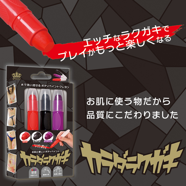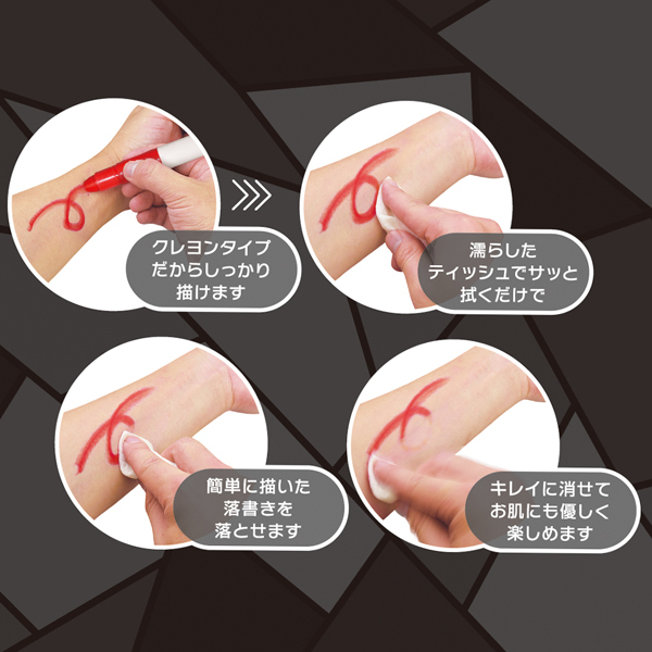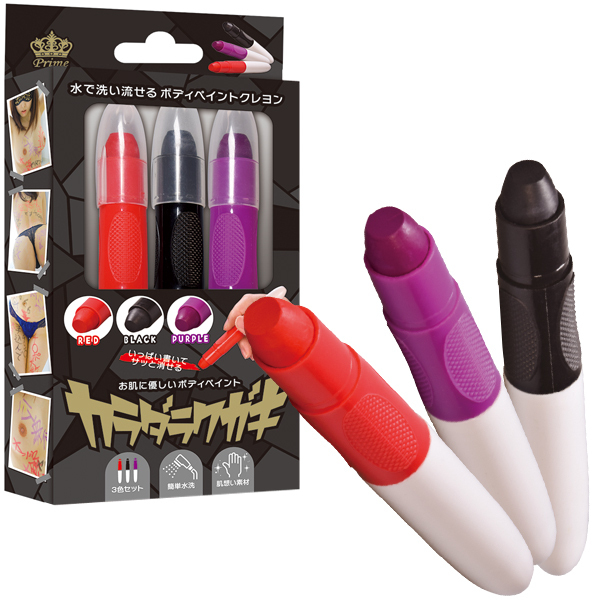 卑猥な言葉を全身に落書き!仮装用にも使えるボディペイント用クレヨン赤黒紫の3色セット。肉便器、性奴隷、発情中などなど好きな凌辱ワードを身体に書いてプレイを盛り上げよう!パートナーとはもちろん、一人で使っても興奮高まる♪素材は肌に優しい水性素材仕様で、濡れた布で拭き取るだけで簡単綺麗さっぱり!ハロウィン仮装のペイントにも◎