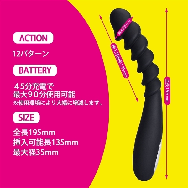 6連続の挿入感が楽しめるユニセックススティックの振動タイプ。出し入れする度にポコポコ続く快感に振動がプラスされてより刺激的なプレイが実現。充電式のリチウムイオン電池は90分充電で45分使用可能。12パターンの振動を好みに合わせて楽しめます。素材は滑らかで肌触りの良いスムースマットシリコン素材採用。IPX5の防水性能で使用後はしっかり洗えて衛生的に遊んで頂けます。絶妙なソリ具合とサイズ感・柔らかさにこだわった特殊形状バイブスティックです。