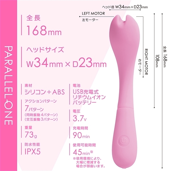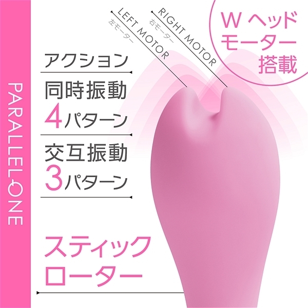 先端に並列で2つのモーターを搭載して、個別に振動させる事が出来るツインモータースティックです。滑らかな肌心地のシリコン素材と振動の質にこだわったモーターを2機搭載。プレジャースポットに合わせた角度と日本人に合ったサイズ感が特徴です。先端は挟んで刺激も出来るように溝を付けています。先端振動は同時振動・個別振動合わせて7パターン。90分充電で最大45分使用可能(使用環境により大幅に増減します)なパワフルなリチウムイオンバッテリーを搭載。IPX5の高レベル防水でしっかり洗えて衛生的です。スマートに振動を楽しめるWモーターヘッドスティックです。●カラー:ピンク