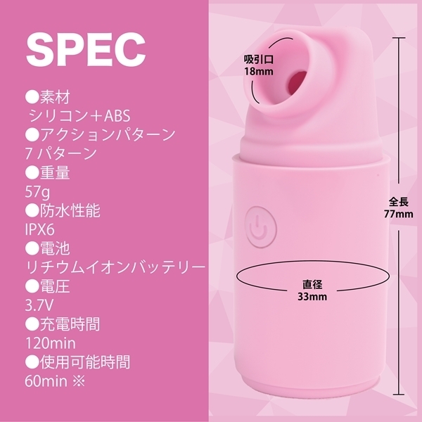 スタイリッシュな見た目で蓋付きだから持ち歩きにも便利な吸引ローター。上質なモーター搭載の吸引機構に高品質シリコン素材の吸引口と持ちやすいサイズ、さらにはIPX6の高レベル防水性能だからしっかり洗えて衛生的です。使用時は蓋を外して底面に付けられます。どこでもキャリー出来る自分だけのプレジャーアイテムです。3.7Vリチウムイオンバッテリー搭載で120分で満充電、最大60分の連続使用が可能です(使用環境により大幅に増減します)。多彩で実用的な7パターンの吸引を演出します。見た目と実用性を兼ね備えたMY PLEASURE GOODSです。●カラー:ピンク
